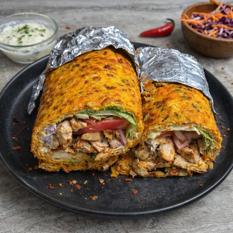 Ant iškepto pagrindo paskirstykite graikišką jogurtą su česnaku ir krapais, dėkite vištieną, pomidorą, salotų lapus ir raudonąjį svogūną, susukite į vyniotinį ir supjaustykite porcijomis.